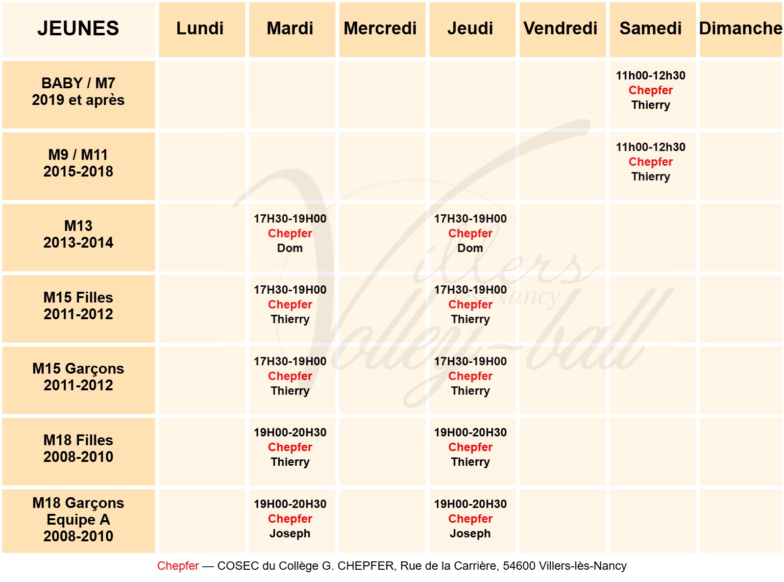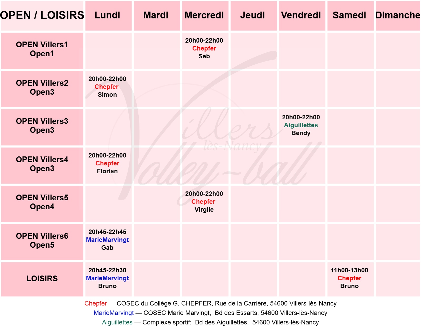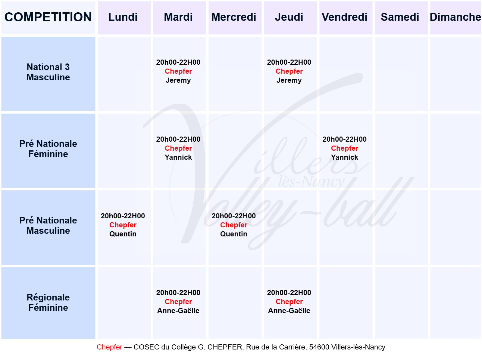 Adresse des lieux d’entraînements :